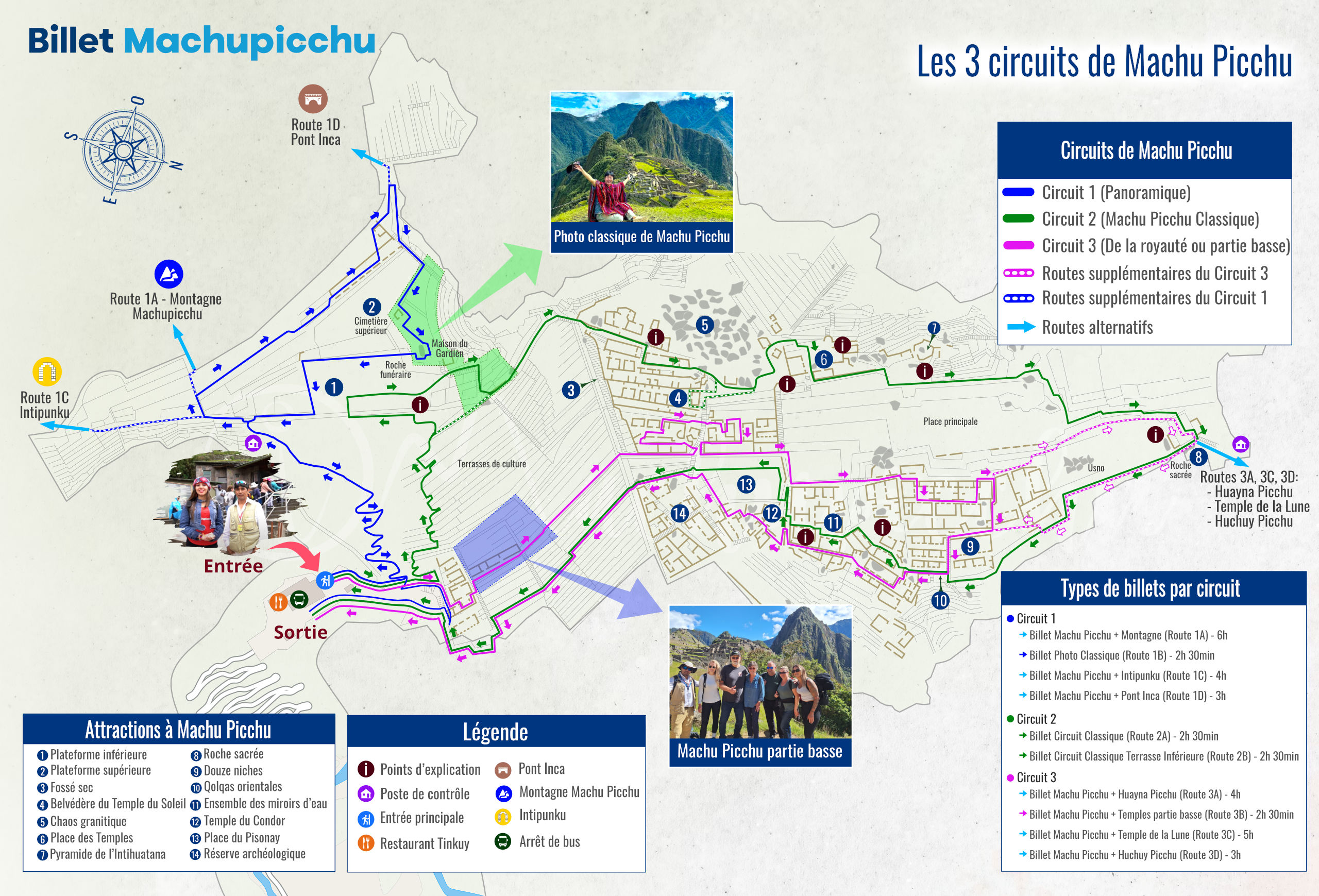Les billets les plus populaires à Machu Picchu incluent l’un des trois circuits officiels qui organisent la visite de la cité inca. Le billet Machu Picchu Photo Classique ou Terrasse Supérieure (Itinéraire 1B) permet de parcourir le circuit 1, idéal pour ceux qui souhaitent obtenir la photo classique de carte postale. Le billet Machu Picchu Circuit Classique Conçu (Itinéraire 2A) offre la visite la plus complète des principales constructions de Machu Picchu. Le billet Machu Picchu Temples Partie Inférieure ou Royauté Conçue (Itinéraire 3B) inclut le parcours du circuit 3, axé sur la zone inférieure de la citadelle avec des temples emblématiques. De plus, Machu Picchu propose des randonnées vers les montagnes entourant la citadelle, la plus demandée étant le sentier menant à la montagne Huayna Picchu, qui inclut également l’accès à Machu Picchu via le circuit 3.